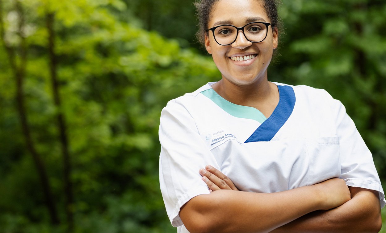 Jessica Akpara, eine engagierte Pflegekraft in unserer RoMed Klinik Bad Aibling, weiß genau, worauf es ankommt: "Eine selbstbewusste Pflege bedeutet für mich, Probleme zu erkennen und entsprechend zu handeln." Als Teil unseres Teams seit 2020, und nach einer fundierten Ausbildung bei RoMed, lebt sie diesen Anspruch jeden Tag aufs Neue. Sie liebt ihren Beruf, geht gerne zur Arbeit und ist stolz darauf, sich stetig weiterzuentwickeln und täglich ihr Bestes zu geben.